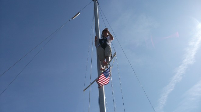 Mardi matin, l’esprit dégagé, le coeur léger, on est prêt pour tout le reste des plaisirs de « La croisière s’amuse », on n’est plus sur un étinéraire à réaliser. On prend le temps. Branlebas de combat au réveil: « T’avais pas de l’entretien à faire, Philippe, y avait pas la pompe de cale à réparer? » Heu oui, puis quelques visses à revisser en passant dans les coffres arrière. Et toujours ce morceaux de drapeau canadien sur L’étai arrière au trois-quart de la hauteur du mat. « Les enrubannages des barres de flèches, c’est pas à refaire, â aussi? » Bien tant qu’à être dans le mat, effectivement aussi bien faire le tour.