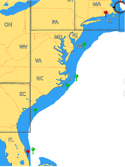 Le marin qui part en mer est toujours plus prudent de tracer sa route souhaitée et de se dire : « au mieux, voici ce qui va se produire ». Puis de garder le réalisme voulu pour ne pas prendre de rendez-vous trop serrés à partir de là. Le point de départ, en rouge au bas, c’est Fort Pierce, FL et le point d’arrivée en haut c’est Bloc Island, au large de New Port, R.I.