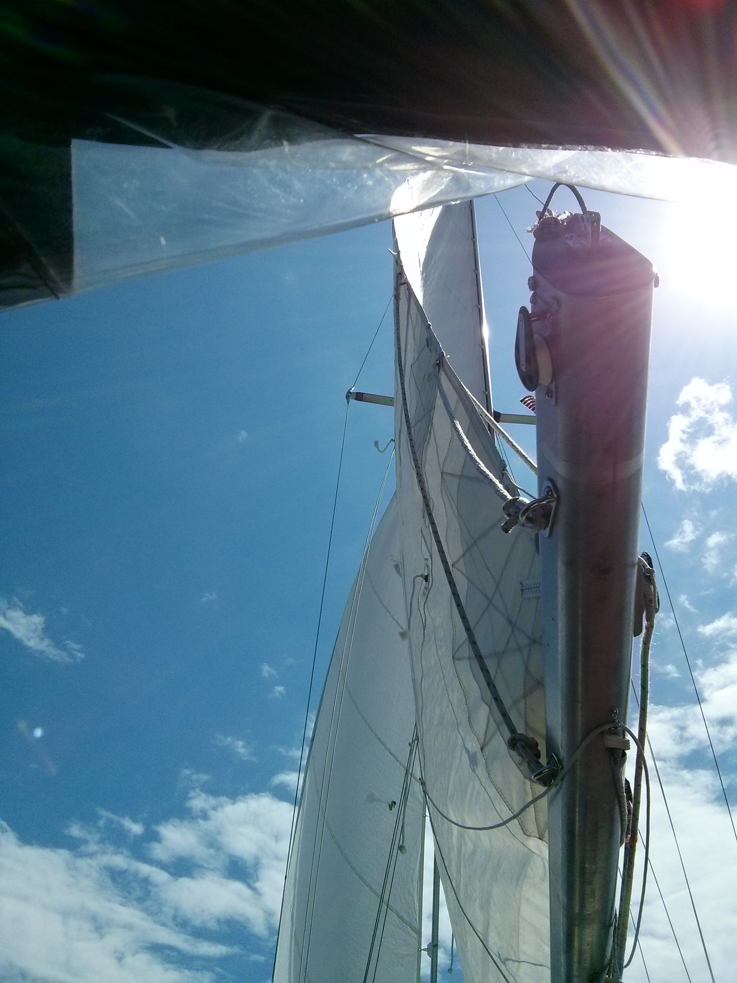 SURPRISES quant à elle ne nous en a fait qu’une toute petite : le manille d’attache du bout de l’écoute de la Gr’Voile qui a cédé quand la vitesse atteignait les 6Nds. Notre pointe pour l’après-midi. Pas de dommage, juste une pièce vite remplacée à l’ancre au bord de l’ile Valcourt.