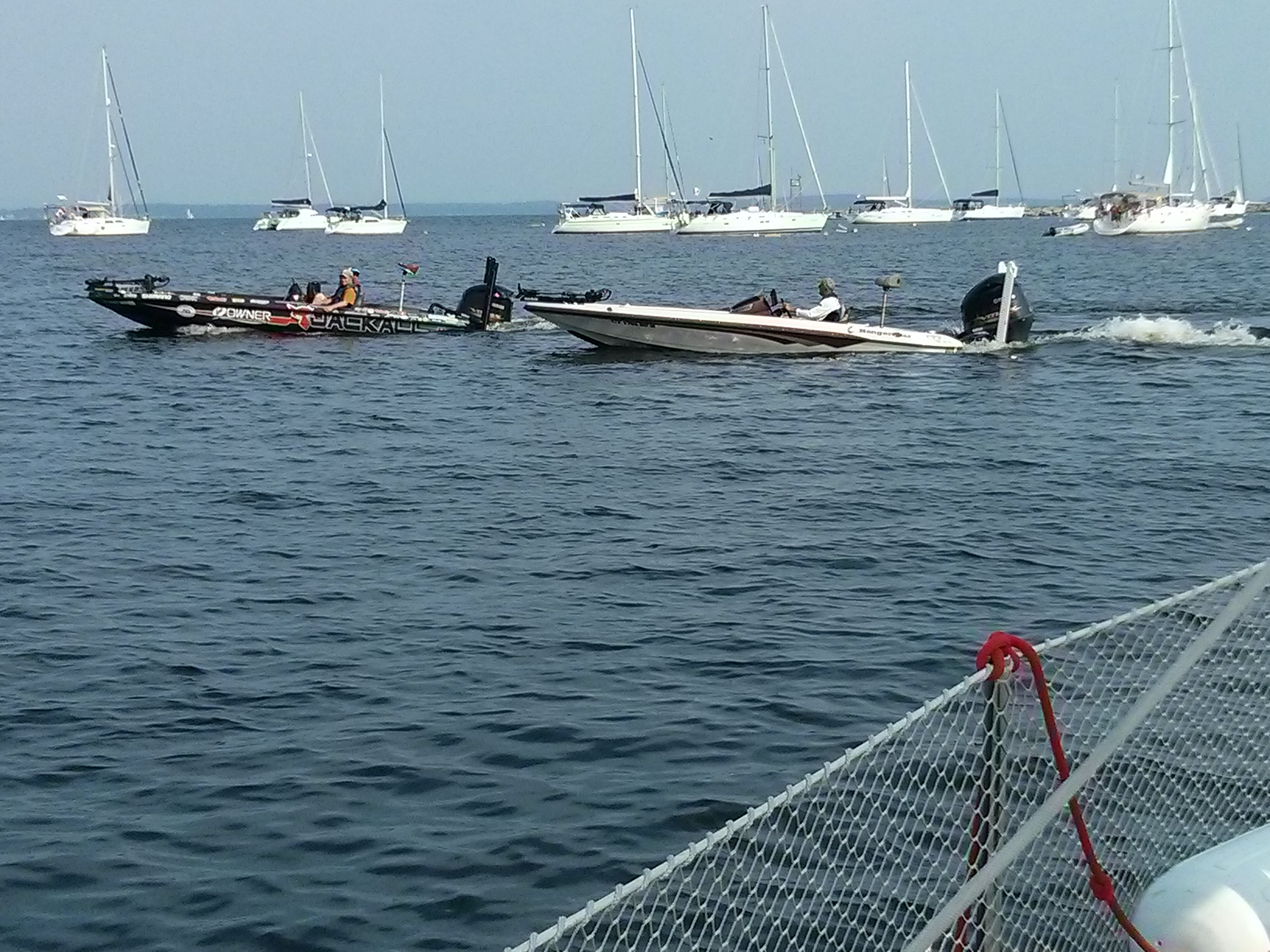 Quoiqu’il en soit, c’est une compétition qui attire des pêcheurs de toute la Côte Est jusqu’en Floride. Ils sont venus avec des embarcations munies d’un moteur de 250 chevaux pour se déplacer ici et la sur le Lac et d’un moteur électrique pour troler. Et effectivement, vous devriez voir l’attirail d’écrans électroniques qui les assistent dans leur quête.