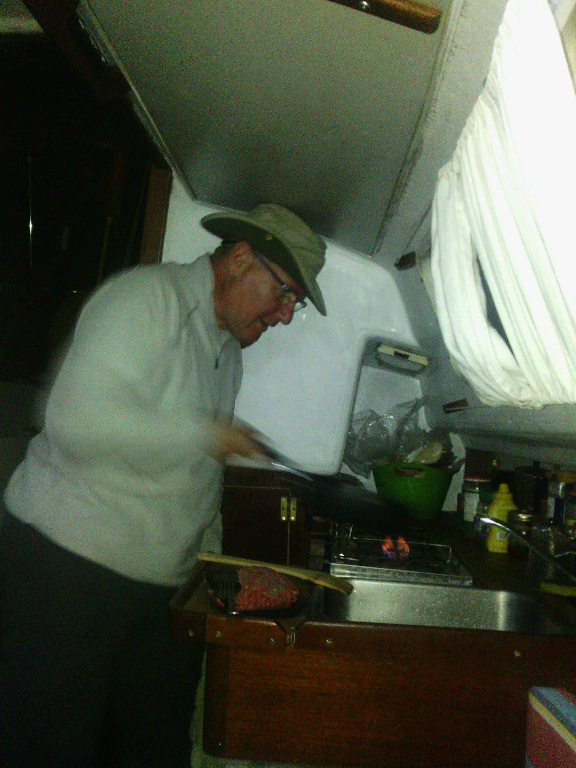 Là, nous sommes à l’ancre dans une petite rivière de pêcheurs à Money Cove pour la nuit. Le vent est tombé et Renaud nous accompagne pendant que Jean-Marie s’affaire au poêle.