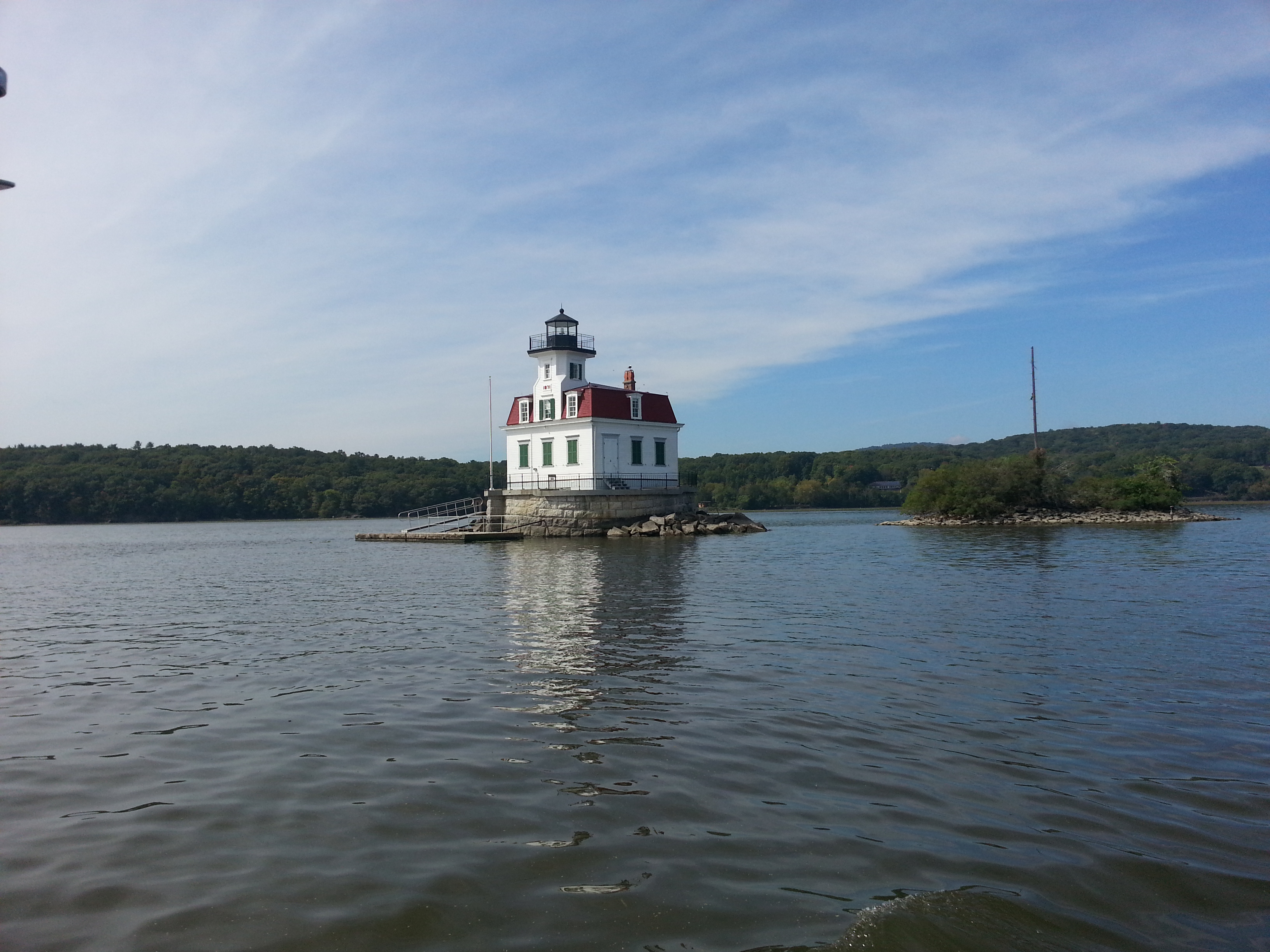 Les maisonnettes des anciens phares,, les barges qui descendent les super cruiser qui remontent, beaucoup de divertissement quoi. Nous sommes partis avec la marée descendance, donc nous faisons beaucoup de chemin pour les premieres heures. Nous coucheront à l’ancre à New Hamberg ce soir, juste au sud de Poughkeebsie (essayez de prononcer).