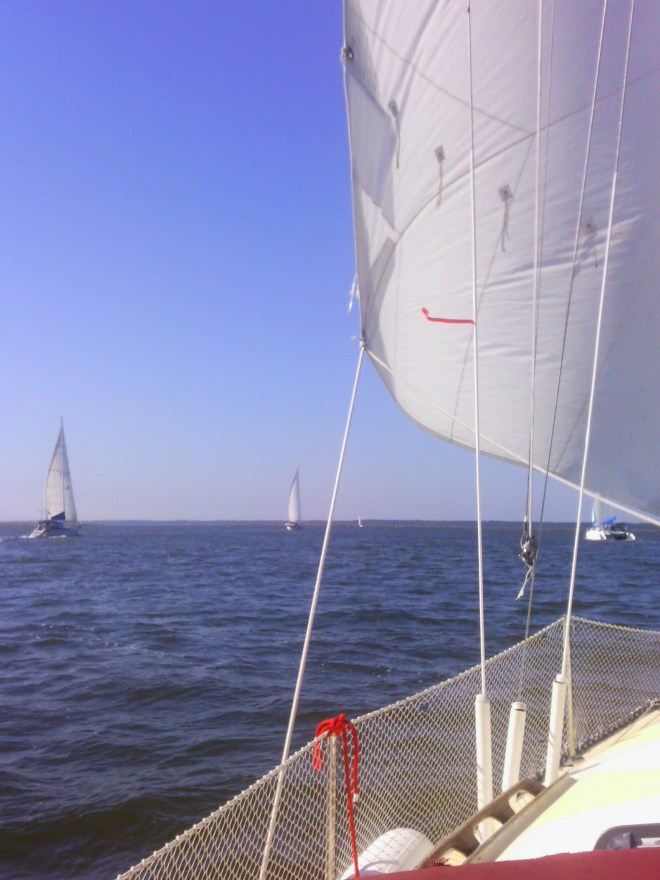 Si vous comptez bien, il y en a quatre sur la photo et deux autres qui me suivaient. C’est un record pour l’Intracostal de voir sept bateaux sous voile au même moment. Il y plus de descendeurs pressés qui espèrent les bouts droits où ils pourront mettre le moteur à fond et arriver au plus vite.