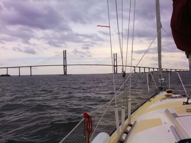 Passé le pont (Un sapré beau pont! Non? 185 pi de hauteur libre dessous. Quand vous passerez par le Centre-ville comptez 20 étages d’un édifice. C’est haut comme cela.) je me dirigeais vers l’Est d’abord puis vers le Sud. La prochaine étape devait être Fernandina Beach, là où nous étions rentrés de nuit sous la pluie, Anne-Marie et moi pendant que Loulou faisait semblant d’avoir le mal de mer à l’intérieur de Brigadoon. Nous étions sortis de Jacksonville avec l’espoir de faire un 36 heures en mer ce matin-là.