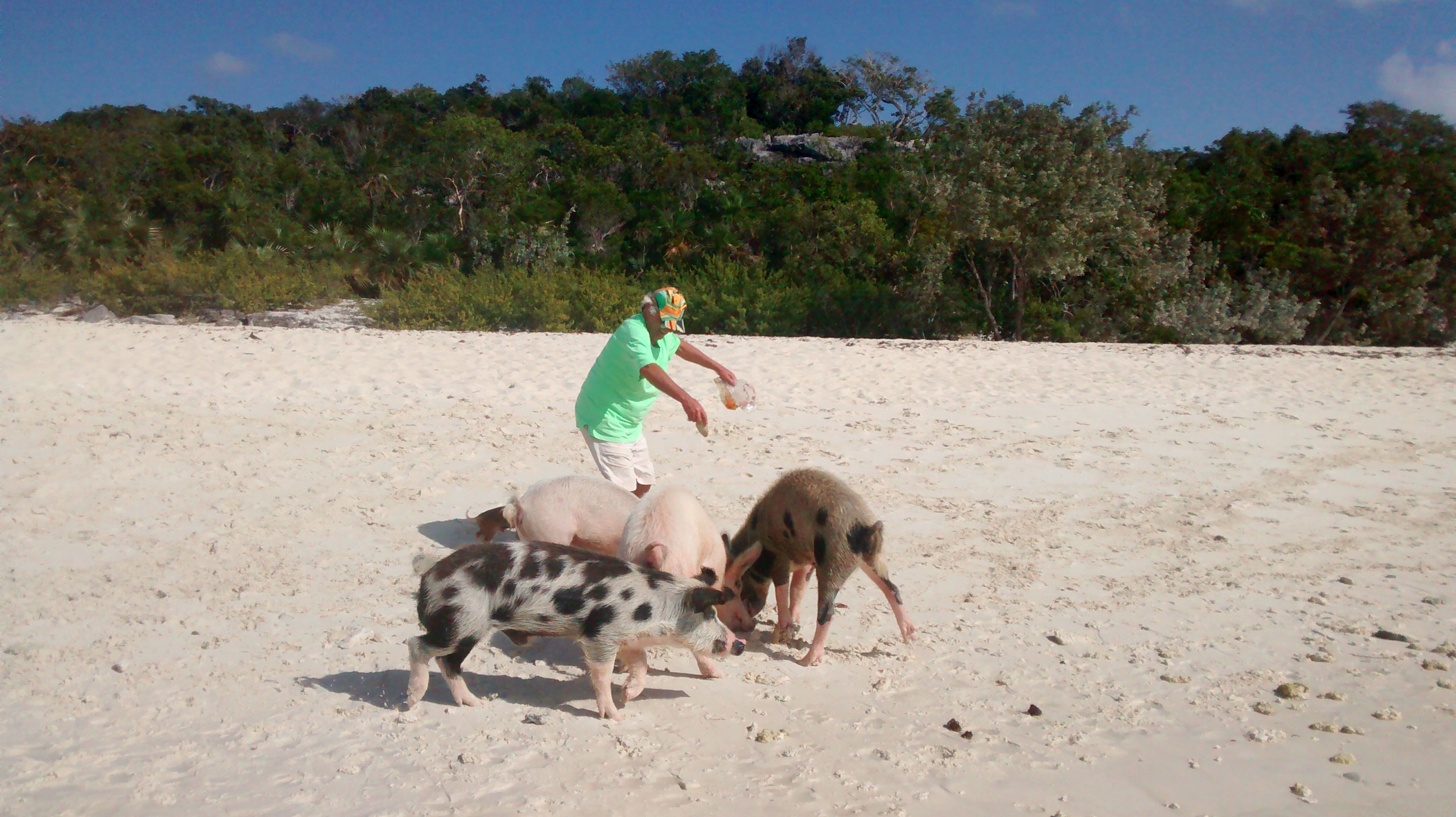 Nous devions nous trouver à Staniel Cay, de l’autre côté à plonger avec les petits poissons multicolores, mais ce sera pour demain, Thunderbolt Cave. Ce soir ce sont les petits cochons de toutes les couleurs qui nous offre l’autre spectacle. Je dois avouer qu’ils sont plutôt entreprenants.