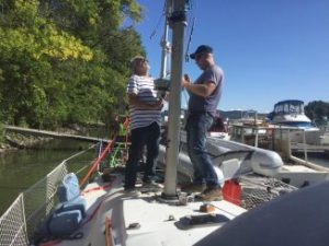 Au final, nous nous sommes retrouvés les derniers entrés à Manasquan et ce n’est que rendus que nous avons retrouvé les trois autres bateaux qui avaient finalement aussi pris la première ré-entrée là où ils pouvaient mettre fin au brassage. Bien sûr, parmis tout ce beau monde, c’est moi que la Garde Côtière a intercepté en entrant dans l’Inlet, pour une inspection de routine. J’ai maintenant mon certificat de conformité pour ce qui est des éléments de sécurité requis à bord. Rassurant pour la suite des choses.